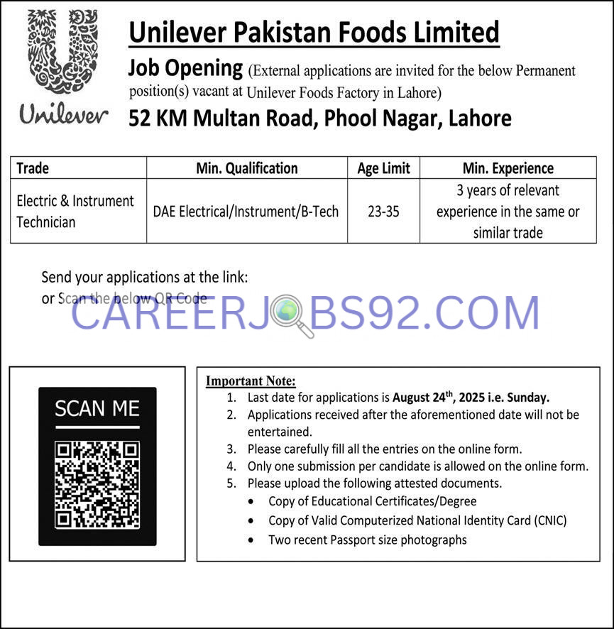 Unilever Pakistan Jobs 2025, Unilever Lahore jobs, Electric Technician jobs Pakistan, DAE Electrical jobs 2025, B-Tech jobs Punjab, Unilever Foods Factory jobs, Technician vacancies 2025.